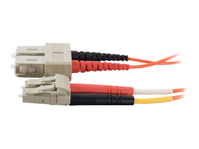 With LC to SC termination, this high-quality fiber optic patch cable is specifically designed for fast ethernet, ATM and gigabit ethernet applications. The small LC connectors satisfy the need for higher port density both in the telecom room and the work area, and offer twice the port density of traditional SC and ST fiber connectors. The LC connector with its RJ-style latch clip design is easy to engage and disengage, and gives each connection greater durability in resisting pulls, strains, snags, and impacts during cabling installs and maintenance. The ST connector features a bayonet locking system.