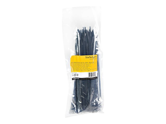 StarTech.com 10"(25cm) Cable Ties, 1/8"(4mm) wide, 2-5/8"(68mm) Bundle Diameter, 50lb(22kg) Tensile Strength, Nylon Self Locking Zip Ties w/ Curved Tip, 94V-2/UL Listed, 100 Pack, Black - Nylon 66 Plastic - TAA (CBMZT10B) - Kabelsamlare - 25.4 cm - svart - TAA-kompatibel (paket om 100)
