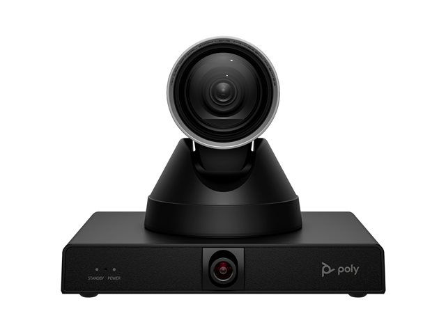 EgenskaperMotoriserad panna, motoriserad lutning, motoriserad zoomning, dubbel lins, 71° horizontal field of view (PTZ camera), 107° horizontal field of view (panoramic camera), 42.7° diagonal field of view (PTZ camera), up to 8 m camera range, Group framing, presentatörsspårning, Poly DirectorAI-teknik