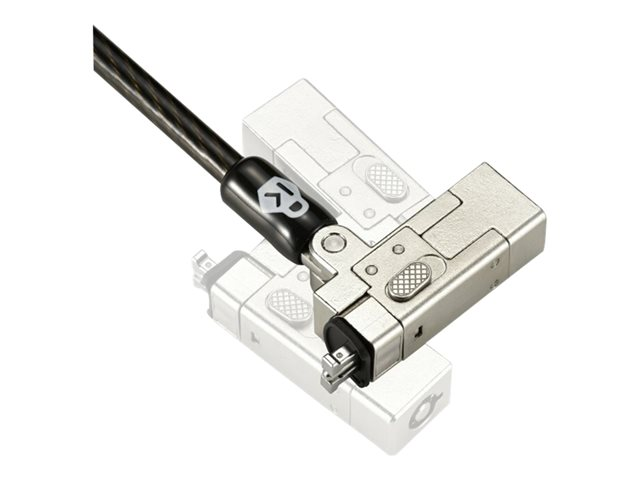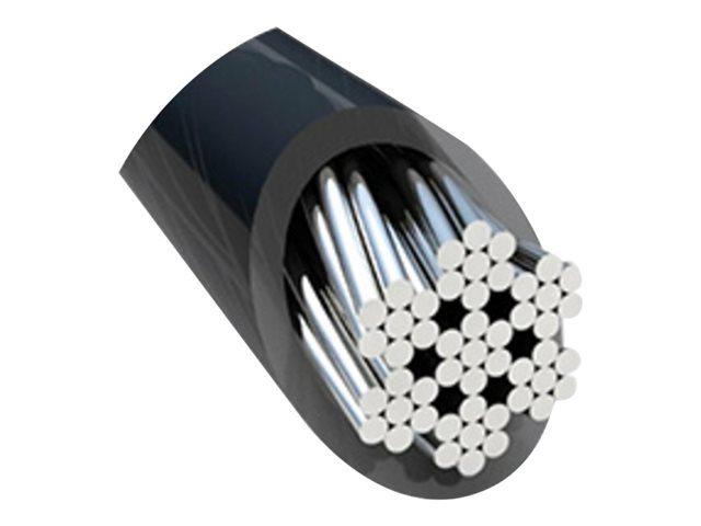 - 1,8 meter (6 fot) lång kolstålskabel står emot skärförsök. Ett skyddande hölje hjälper till att skydda fästpunkter som skrivbord och bord mot repor.