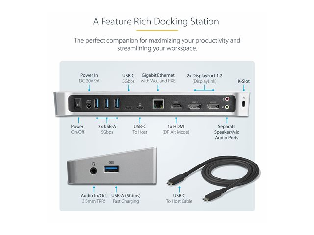 StarTech.com 4K USB-C-docka för tre skärmar med 5 USB 3.0-portar - 100W PD - Dockningsstation - USB-C - HDMI, DP - 1GbE - 100 Watt - TAA-kompatibel DK30CH2DEPUE